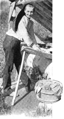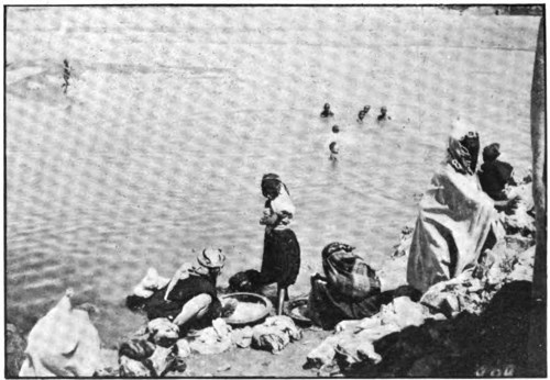 The top snapshot on the next page was taken during a tramp through the jungly district around Sourabaya, a small town in Java. The picture shows a Javanese woman washing her child under a falling stream of water. Evidently the youngster is not enjoying the performance, and evinces his disapproval of the proceedings by kicking out in all directions and struggling vigorously. As a result of these contortions the outline of his body in the picture is rather obscure. It is interesting to note how the water has been brought to the rudely-constructed circle of masonry which serves as a reservoir. Having no system of pipes to facilitate the distribution of water, the natives fall back on Nature to assist them in this direction. They cut down betelnut trees, split them in half from top to bottom, and scoop out the inside substance, thus making 517 a series of cylindrical troughs. These are dried in the sun, after which a number of them, joined end to end and placed at a gentle slope, will convey water from any natural source to within convenient distance of a village or group of houses. The end of one of these artificial water-courses is seen in the picture.