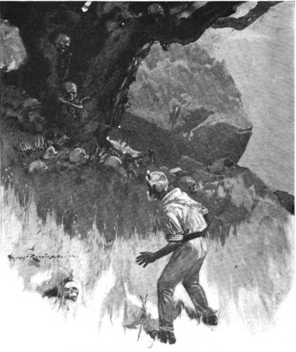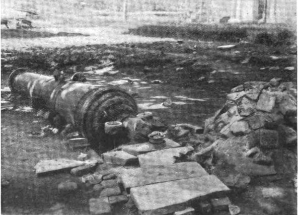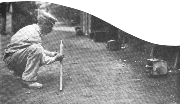 A six-inch fuse was then placed in the gun 513 and lighted, and everyone retired into an adjacent pit, dragging old Jack with them. For a moment all was silence; then came an awful ear-splitting report, and a cloud of dust settled over the rifle pit. When it cleared away all trace of Flagett’s cannon and the stump as well had disappeared. Not a piece of either was ever found, though Hall Smith, who was in charge of the cook-camp half a mile farther back, swore that he heard a piece of pipe whistle over his head a few seconds after the explosion.