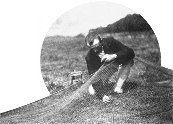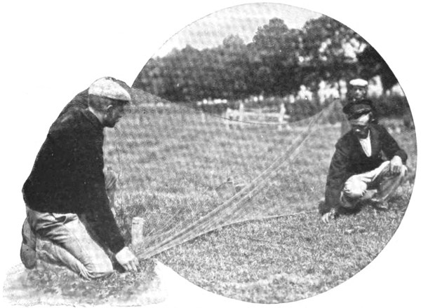 During the summer months these “concours” are held at very frequent intervals in the country districts of both France and Belgium, and a competitor is frequently the possessor of several birds, which are usually caught by means of a net, but almost every method is productive of quick results, for the chaffinch is an eager wooer, his addresses to his lady-love rendering him totally blind to his own danger. He is beset with rivals, and as the female bird invariably smiles upon the strongest suitor she is the cause of innumerable battles, in which it is usual for several lovers to be left dead upon the field. The chaffinch is very easily trapped by using a tame finch to stir up his jealousy. A limed twig is attached to the tame bird, who is allowed to run about where the twittering of the wild birds is heard. As soon as the latter become conscious of the presence of an alien in their midst an onslaught is made, which generally ends in the capture of one, if not more, of the attackers. Another method of capturing the chaffinch, and the one most in vogue among the Flemish “Vinkeniers,” is represented in two of the accompanying photographs. A stuffed finch fixed to a small peg is placed in the grass, clearly visible to the birds in the trees, while a live decoy, in a cage, carefully covered up with loose grass and twigs, so as not to attract any attention, is concealed not many yards away. A long net, spread out on the ground between the two decoy birds, lies in readiness to make prisoners of the little feathered warriors as soon as they cluster round the stuffed bird, incited by the clamours of the caged enticer. A pull of the long strings, leading into the ambush of the bird-catchers, may cause as many as thirty finches at a time to fall into the hands of the trappers. 509