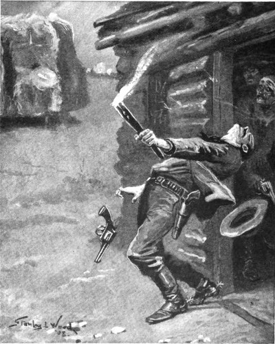 Within the ranch-house all was quiet. The twenty men selected for the dash stood with their right hands clenched around the butts of their heavy Colts and their lefts grasping kerosene-soaked torches. All eyes were fixed on their leader, who stood next to big Ben Williams, who was noiselessly removing the bars from the door. “Ready, boys!” came in clear, low tones from Benton as the last bar was lifted from its socket. Every man braced himself for the leap—ready, in fact, anxious, to have the dreadful suspense at an end, though each well knew that the opening of the door would be a signal for five hundred rifles to sweep the space between the house and the fort with a perfect hail of lead. Quickly the door swung open, and Benton leaped out. His eyes swept the surrounding hills; then he turned and tried to leap back into the protection of the log walls again. But all in vain! Quicker than thought came a flash of fire from a loophole in the fort, and Benton fell in the doorway with a bullet from Tom Champion’s rifle through his lungs.