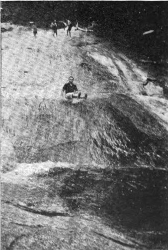 The “Mengeleusha,” or “slippery place,” near Kuala Kangsar, Perak, Federated Malay States, is a solid piece of granite, about seventy or eighty feet long, standing in a stream of water and forming a sort of waterfall. The water flowing down this rock makes it as slippery as glass, and the amusement is to slide down the rock and splash into the pool beneath. This snapshot shows an Englishman half-way down the slide.—“THE STRAND MAGAZINE.”