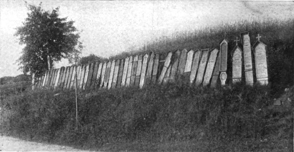 In the eastern half of Bavaria, on the borders of Bohemia, lies the so-called Bavarian Forest. This part of the country, although it boasts beautiful scenery, is seldom visited by tourists, probably for the reason that the charms of the region are little known even in Germany. This part of Bavaria has been in many ways untouched by civilization, and owing 518 to its seclusion from the outer world some very strange customs are still in vogue, strongly reminding one of the Middle Ages. One of these strange customs, strictly observed by the population, is the way in which they keep alive the memory of their dead by the erection of what are called “totenbretter,” or “death-boards.” These are wooden planks cut in the shape of tombstones and roughly painted. Sometimes they bear also the image of a saint. They are erected—often in a row of thirty and more—on the roadside, in fields and meadows, near chapels and crucifixes, in the village streets—in short, everywhere; they are even nailed to houses and barns. They do not mark burial-places, as might be supposed. As soon as a person has died the corpse is put on a board, and there it lies in state until it is put into the coffin shortly before the funeral. These boards, then, are the so-called “death-boards,” and after the funeral they are cut into a suitable shape, and decorated with an inscription containing the name of the deceased, his age, and, in most cases, some lines of poetry. These short poems, which are, of course, meant in sober earnest, are occasionally very amusing. The boards are then stuck somewhere near the road, or in the fields, where they sometimes accumulate to an alarming number. In the poorer districts these boards are not always cut into shape and painted, but are simply deposited just as they are at the foot of some crucifix, where they remain untouched until they moulder away. It must be admitted that the custom, though interesting, seems open to objection from a hygienic point of view, nor is it very exhilarating for the tourist to be reminded of death wherever he may turn.