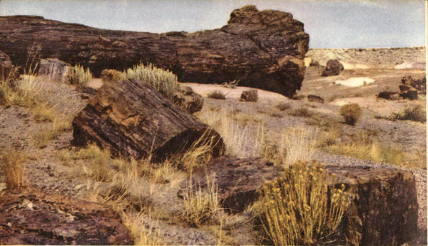 During the latter part of what geologists call the Triassic period, about 160 to 170 million years ago, most of northeastern Arizona was apparently an extensive flood plain; low, flat, and swampy. Numerous streams, some of them quite large, flowed out from the surrounding low hills into the plain. These streams brought enormous quantities of sediments; mud, sand, and other minerals, spreading it out layer upon layer as they shifted their flow back and forth just as on present river deltas. These sediments contained huge amounts of volcanic ash which the streams apparently picked up near their sources. This ash was largely silica, the mineral which was later to be of major importance in the petrification of the wood. (Silica (SiO₂) is the oxide of silicon, a non-metallic element making up 28 per cent of the earth’s crust. The crystal form of silica is quartz, the commonest of all minerals, which is found in large amounts in many volcanic rocks.)
