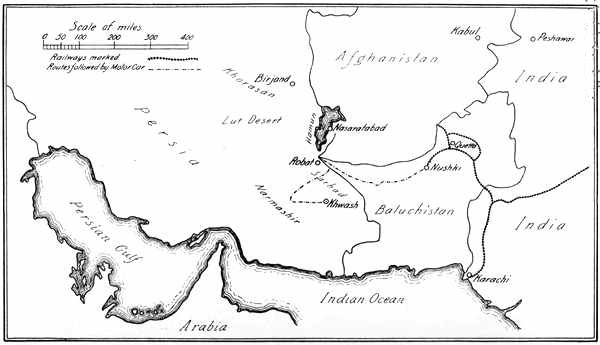 | I receive my orders—German agents and India—Their routes—A deal in chauffeurs—Concerning an appetite and sausages—Nushliki— The last of civilisation—Further information—Sand-holes and digging—Petrol in the desert | 15 |