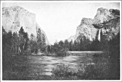 Rest here for a time by the side of the Merced River while I tell you something of this peaceful, lovely valley. Look over to that further cliff and watch the silver stream of the Yosemite descend in three gleaming white steps from the summit of rock 2,600 feet above us to the meadow level where we stand. In its first flight of 1,430 feet it falls a third of that distance in a snowy column, then turns to wreathing smoke, through which many glistening darts shoot down to the rocky basin below. Here the misty elements are resolved again into water, and the stream tumbles frothing through rocks to its second flight, then on to the lower fall of 320 feet, when it dashes on a bed of boulders and hurries to join the Merced River.