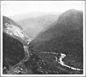 The Yosemite has been gradually disclosing its features to us since early morning. The first impression that we experience as we leave the town of Merced is one of steady ascent into a narrow gorge, through which a busy, turbulent stream—the Merced River—pursues its course. The train labors sturdily up until it reaches El Portal, where there is a pause at the hotel for lunch. Then the trip is resumed in auto buses that take us on up through a valley, winding and narrowing into a notch that seems at times as if it would end in sheer walls of rock. But, in the course of an hour or more the way broadens, and we find wider stretches, wooded with tall pines and stately sequoias.