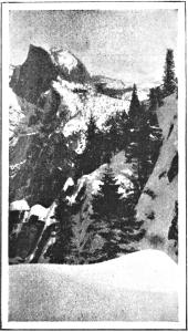 Half Dome was first ascended in 1875 by George Anderson. He practically pulled himself to the summit by means of a rope attached to iron pegs driven in the rock. He inserted his bolts five or six feet apart, and made his rope fast to each in succession, resting his feet on the last bolt while he drilled a hole for the next above. He accomplished his ascent in a few days; and he hoped to complete a stairway, so that tourists might ascend the Dome. But while he was preparing timber for his stairway he was taken sick, and died all alone in his little cabin.