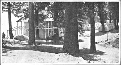 This is camp life in its most elementary aspect. From that the conditions of tent and bungalow life in the Valley range up to the finely equipped and organized camps, where the visitor may enjoy all the advantages and luxuries of comfortable hotel life, while at the same time living close to the ground. The established camps at present are Awahnee, El Capitan, Yosemite Camp, Lost Arrow and Camp Curry. The affairs of each camp are managed from its own central office, a building where mail is received and the interests of the campers are looked after. The daily life of these communities is full of incident. Each camp has its entertainments and its gala performances. One has a fine, large bathing pavilion and plunge; another, a festival hall. Moving pictures are exhibited in the evenings; there are lectures and concerts; and a large, well equipped dancing pavilion makes the hours fly fast for young people. Communication between the camps is easy, for there are auto-buses, “jitneys,” as well as ponies and burros, and things are stirring actively among the camps most of the time. No one need lack for entertainment. Between the single tent in a remote part of the Valley and the populous camp community there is a wide range for choice, and variety of conditions enough to make everyone happy.
