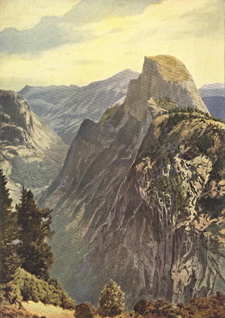 Half Dome, or South Dome, as it is sometimes called, rises at the head of the Yosemite Valley to the height of 4,892 feet above the valley floor. It forms the eastern terminus of the Valley. It is one of the wonders of the natural world, and is a unique thing in mountain scenery. Sweeping up 3,000 feet, its walls bear only a few pine trees. Above this it ascends perpendicularly nearly 2,000 feet straight into the sky, while its rounded summit falls steeply curved on the opposite side. It has been described as “incomparably the most wonderful, striking and impressive feature of the region. In strangeness of shape this hemispherical mountain of solid granite is singular among the world’s geological marvels, and its sublime height and firm soaring outline impose it upon the imagination more than would be possible to bulk alone. From every part of the upper half of the Valley the eye is compelled, as if by force of physical attraction, to return to this extraordinary mountain, which one can never tire of contemplating. One looks upon it as one would gaze at some majestic fragment of statuary.”