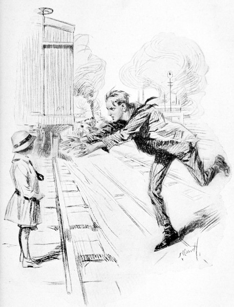 That they didn’t travel absolutely due north was only because the track chose to lead more westerly. By the time the sun was really in sight they had covered the better part of a half-mile and had caught a glimpse of a good-sized town in the distance. Tall chimneys and a spire or two pointed upward above a smoky haze. They crossed a big bridge beneath which flowed a broad and sluggish river, and had to flatten themselves against the parapet, Sam held tightly in Wayne’s arms, while a long freight train pounded past them on the single line of track. Beyond the bridge a “Yard Limit” sign met them, and the rails branched and switches stood up here and there like sentries and a roundhouse was near at hand. But they found their first habitation before that in a tiny white cottage set below the embankment, its gate facing a rambling clay road, rutted and pitted, that disappeared under a bridge. There was a path worn down the bank to the road, and Wayne and June and Sam descended[14] it. A trail of smoke arose from the chimney of the house straight into the morning sunlight and suggested that the occupants were up and about.