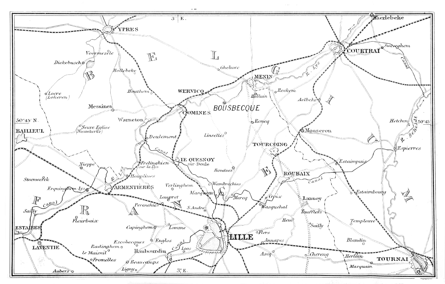The geographical position of Bousbecque has an important bearing on the biography of the Ambassador; as the place is not marked in English maps, a plan of the district is given in this volume showing the relative positions of Bousbecque, Comines, Wervicq, Halluin, &c. It will be seen that Bousbecque lies on the river Lys, about two miles from Comines. In the times with which we shall have to deal, it formed part of the County of Flanders; it is now part of the French frontier, and is included in the Département du Nord.