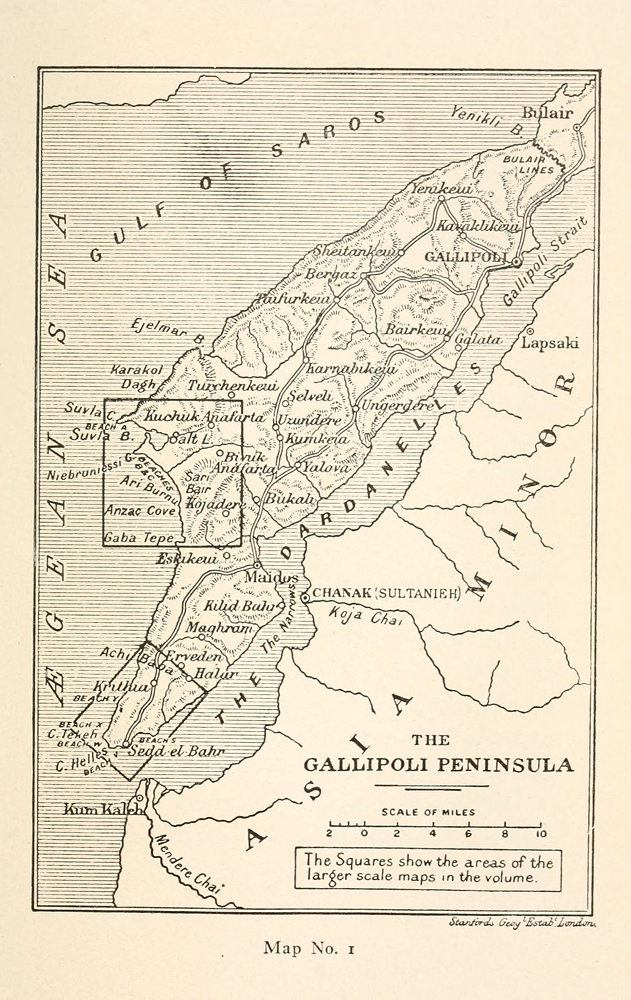 The Peninsula of Gallipoli, or Thracian Chersonese, from its beginning in the Gulf of Xeros to its extremity at Cape Helles, is a tongue of hilly land about fifty-three miles long, between the Ægean Sea and the Straits of the Dardanelles. At its northeastern, Gulf of Xeros or European end it is four or five miles broad, then a little to the south of the town of Bulair, it narrows to three miles, in a contraction or neck which was fortified during the {5} Crimean War by French and English soldiers. This fortification is known as the Lines of Bulair. Beyond these lines, to the southwest, the peninsula broadens in a westward direction, and attains its maximum breadth, of about twelve miles, some twenty-four miles from Bulair, between the two points of Cape Suvla, on the sea, and Cape Uzun, within the Straits. Beyond this broad part is a second contraction or neck, less than five miles across, and beyond this, pointing roughly west-southwesterly, is the final tongue or finger of the Peninsula, an isosceles triangle of land with a base of some seven miles, and two sides of thirteen miles each, converging in the blunt tip (perhaps a mile and a half across) between Cape Helles and Cape Tekke. There is no railway within the peninsula, but bad roads, possible for wheeled traffic, wind in the valleys, skirting the hills and linking up the principal villages. Most of the travelling and commerce of the peninsula is done by boat, along the Straits, between the little port of Maidos, near the Narrows, and the town of Gallipoli (the chief town) near the Sea of Marmora. {6} From Gallipoli there is a fair road to Bulair and beyond. Some twenty other small towns or hamlets are scattered here and there in the well-watered valleys in the central broad portion of the Peninsula. The inhabitants are mostly small cultivators with olive and currant orchards, a few vineyards and patches of beans and grains; but not a hundredth part of the land is under cultivation.