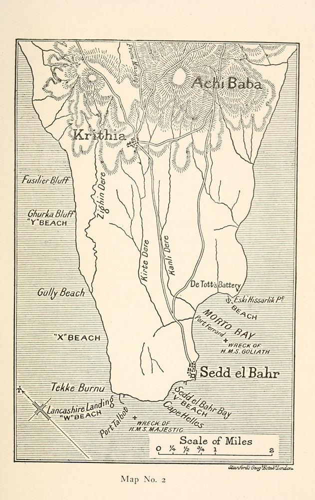 Those who look at the southwestern end of the Peninsula, between Cape Suvla and Cape Helles, will see three heights greater than the rolling wold or downland around them. Seven miles southeast from Cape Suvla is the great and beautiful peaked hill of Sari Bair, 970 feet high, very steep on its sea side and thickly fleeced with scrub. This hill commands the landing place at Suvla. Seven miles south from Sari Bair is the long dominating plateau of Kilid Bahr, which runs inland from the Straits, at heights varying between five and seven hundred feet, to within two miles of the sea. This plateau commands the Narrows of the Hellespont. Five miles further to the southwest and less than six miles from Cape Helles is the bare and lonely lump of Achi Baba, 590 feet high. This hill commands the {9} landing place at Cape Helles. These hills and the ground commanded by them were the scenes of some of the noblest heroism which ever went far to atone for the infamy of war. Here the efforts of our men were made.