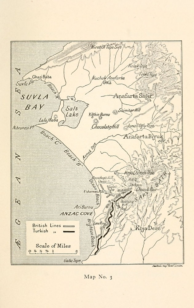 Those who wish to imagine the scenes must think of twenty miles of any rough and steep sea coast known to them, picturing it as roadless, waterless, much broken with gullies, covered with scrub, sandy, loose and difficult to walk on, and without more than two miles of accessible landing throughout its length. Let them picture this familiar twenty miles as dominated at intervals by three hills bigger than the hills about them, the north hill a peak, the centre a ridge or plateau, and the south hill a lump. Then let them imagine the hills entrenched, the landing mined, the beaches tangled with barbed wire, ranged by howitzers and swept by machine guns, and themselves three thousand miles from home, going out before dawn, with rifles, packs, and water bottles, to pass the mines under shell fire, cut through {10} the wire under machine gun fire, clamber up the hills under the fire of all arms, by the glare of shell-bursts in the withering and crashing tumult of modern war, and then to dig themselves in in a waterless and burning hill while a more numerous enemy charge them with the bayonet. And let them imagine themselves enduring this night after night, day after day, without rest or solace, nor respite from the peril of death, seeing their friends killed, and their position imperilled, getting their food, their munitions, even their drink, from the jaws of death, and their breath from the taint of death, and their brief sleep upon the dust of death. Let them imagine themselves driven mad by heat and toil and thirst by day, shaken by frost at midnight, weakened by disease and broken by pestilence, yet rising on the word with a shout and going forward to die in exultation in a cause foredoomed and almost hopeless. Only then will they begin, even dimly, to understand what our seizing and holding of the landings meant.