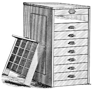 Sort-Case Cabinet.—Contains eight drawers, each divided into sixteen compartments. It will be found useful as a receptacle for quads, leaders or sorts.
