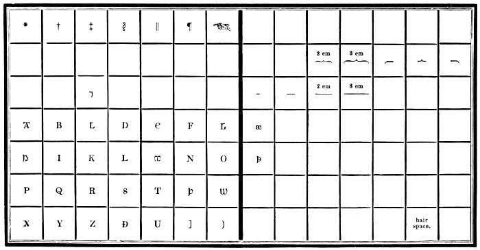 | Types—Roman letter—Italic—Black—Anglo-Saxon—Names and sizes of type—Gradations of type—Point System of Type bodies—A Bill of Pica—A Fount of type—Capitals—Small capitals—Points—Apostrophe—Hyphen—Parenthesis and Bracket—References—Accents—Numerals—Arabic figures—Old-style figures—Cancelled figures—Fractions—Signs—Metal rules or dashes—Braces—Spaces—Two-line letters—Quadrates—Quotations—Labour-saving quotation furniture—Hollow quadrates—Circular quadrates—Labour-saving curvatures—Leads—Flowers and borders—Brass rule—Brass labour-saving rule—Improved labour-saving rule case—Earliest written sounds—Hieroglyphic alphabet—Runic alphabets—Anglo-Saxon alphabet and plan of cases—German alphabet and plan of cases—Greek alphabet and plan of cases—Hebrew alphabet and plan of cases—Russian alphabet—Comparative table of bodies of Music type—Music composition—Music cases—Modern conveniences. | |