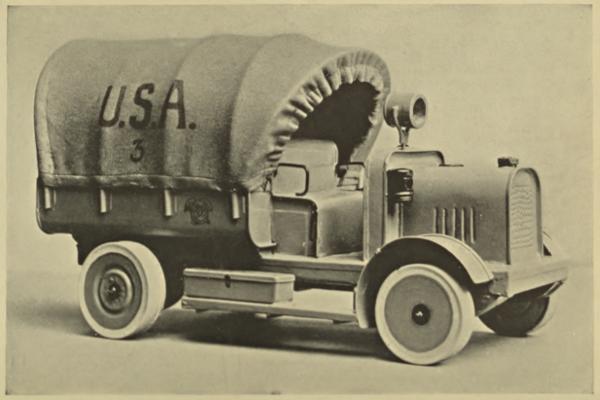 “For the officers’ wards, barracks, and recreation hut, we made tin candlesticks, flower holders, ash trays, electric light shades, tea trays, desk sets, and filing boxes. All of which were not only useful but quite ornamental, as they were attractively painted and decorated by the patients. The soldiers took great interest in the making of mechanical toys, especially war-like ones, such as tanks, aeroplanes, cannon and army trucks.