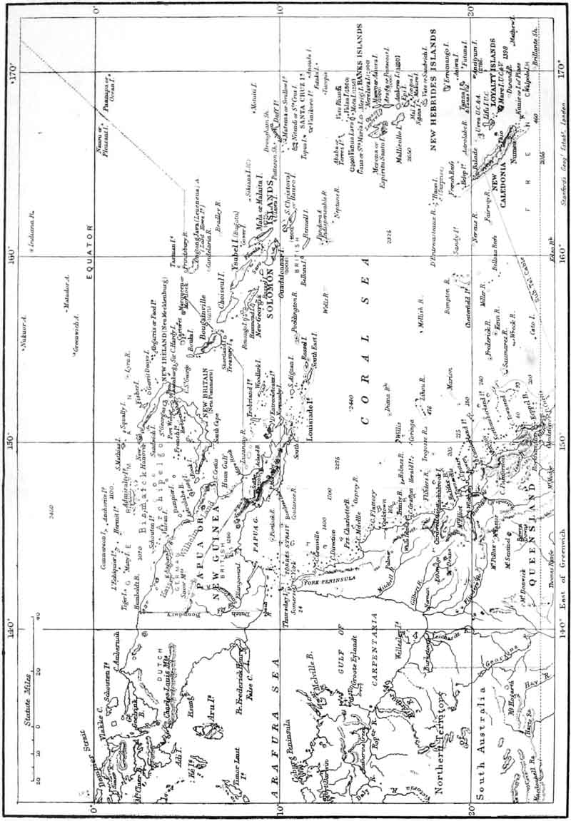 There no islands in the new world which have been the scene of greater adventures, more daring exploits, and more exciting times than those in the South Seas. From the earliest days New Guinea, New Britain, Solomon Islands, and the New Hebrides have been inhabited by a race of savages, on whom neither the efforts of missionaries nor the oaths of traders have been able to make much impression. For years the white man has tried in vain to break the spirit of these cannibals; with fire and sword whole villages have been swept away, but neither by fear nor by kindness have the natives been weaned from their worst customs, and it will take many years and much education, and perhaps the complete extinction of the old generation, before they cease to be savages. For over sixty years {14} the missionaries have been working amongst them and have taught many to read, and sent them out amongst their brethren armed with Bibles and tracts in their native languages, but all this has been of little avail; every day we hear of massacres and risings, and missionaries and traders are pounced on and murdered, and there is no accounting for these outrages which make the problem more difficult to solve. For months or even years men may live on the friendliest terms with a tribe, and then suddenly, and for no apparent reason, the natives will rise up and slay them. The whim of a chief, an angry word, a bad bargain, a superstitious fear, any of these trivialities may be the cause of a rising, and may mean the death of dozens of innocent people.