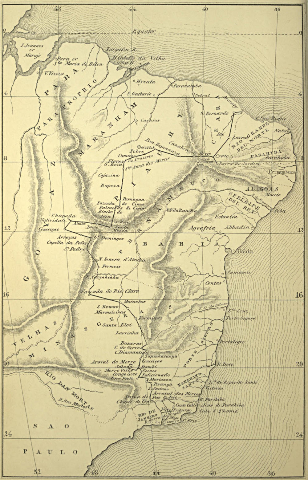 | Leaves San Romão—Passes Guaribas—Passagem—Geräes Velhas—Espigão—Caisára—Cabeceira—Arrives at the Villa de Formigas—Town described—Account of the impostor Douville—Country around rich in Botanical products—Passes Viados—Arrives at the Arraial de Bomfim—Reaches San Elo—Sitio—Comes to a Gold Working called Lavrinha—Crosses the River Inhacica—Reaches As Vargems—Registo do Rio Inhahy—Bassoras on the River Jiquitinhonha—Examines a Diamond Mine—Formation in which the Diamond is found—Mode of working it—Arrives at the Arraial de Mendanha—Town described—Ascends the Serra de Mendanha—Reaches Duas Pontes—Arrives at the Cidade Diamantina, formerly the Arraial de Tijuco, the Capital of the Diamond District—Town situated on side of hill—Description of its Population—Their mode of Dress—Its cold Temperature—Productions of its Neighbourhood—Mining for Diamonds, formerly a privileged Monopoly, now open to all—Character of Miners—Extent of Diamond Mines—Privilege of Slaves there employed—Climate very healthy—Women very handsome—Complaints incident to its Climate—Loyalty shown by its Inhabitants—Fatality among Horses | 320 |