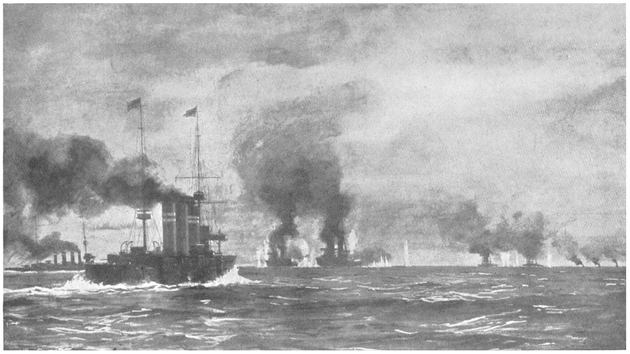The signal was given, “Open fire and engage the enemy,” and the Inflexible began the battle, followed a few minutes later by the Invincible. This firing was at a range of about nine miles—no opportunities for boarding here, cutlass in teeth, and pistols in both hands!—but the British gunnery was so good that three of the German ships turned away. Then the Glasgow, with the Cornwall and the Kent, gave chase. We shall follow their work when we have considered that of the heavier craft.