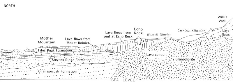 Geological cross section of Mount Rainier and its foundation rocks from Mother Mountain southward to Tatoosh Range. True-scale cross section is nearly 17 miles long. Slightly modified from U.S. Geological Survey Professional Paper 444, Plate 1. (Fig. 4)