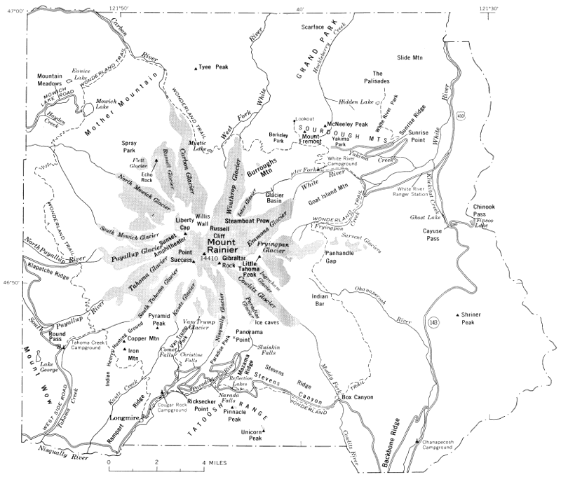 Seen from the Puget Sound country to the west, Mount Rainier has an unreal quality—its white summit, nearly 3 miles high, seems to float among the clouds. We share with the populace of the entire lowland a thrill as we watch skyward the evening’s setting sun redden the volcano’s western snowfields. When you approach the mountain in its lovely setting, you may find something that appeals especially to you—the scenery, the wildlife, the glaciers, or the wildflowers. Or you may feel challenged to climb to the summit. Mount Rainier and its neighboring mountains have a special allure for a geologist because he visualizes the events—some ordinary, some truly spectacular—that made the present landscape. Such is the fascination of geology. A geologist becomes trained to see “in his mind’s eye” geologic events of thousands or even millions of years ago. And, most remarkable, he can “see” these events by studying rocks in a cliff or roadcut, or perhaps by examining earthy material that looks like common soil beneath pastureland many miles away from the volcano.