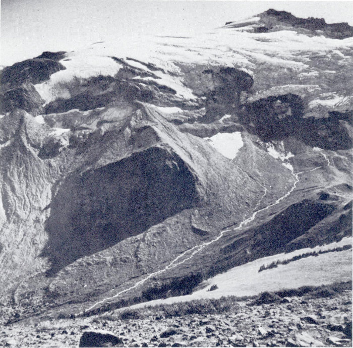 Two ice streams meet to form the half-mile-wide Cowlitz Glacier. One heads on the flank of the volcano and the other (Ingraham Glacier) at the summit. The firnline is a short distance above the junction of the glaciers. The high bare embankment at the extreme right is a lateral moraine that was formed about 100 years ago when the glacier was thicker and about 1½ miles longer. (Fig. 12)