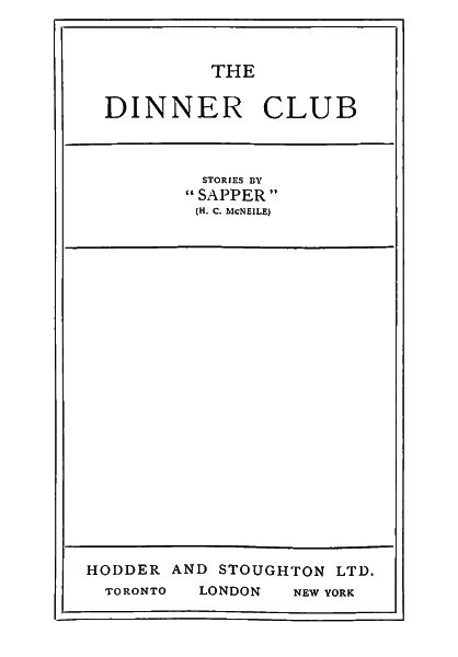 The Project Gutenberg EBook of The Dinner Club, by H. C. (Sapper) McNeile This eBook is for the use of anyone anywhere in the United States and most other parts of the world at no cost and with almost no restrictions whatsoever. You may copy it, give it away or re-use it under the terms of the Project Gutenberg License included with this eBook or online at www.gutenberg.org. If you are not located in the United States, you'll have to check the laws of the country where you are located before using this ebook. Title: The Dinner Club Author: H. C. (Sapper) McNeile Release Date: October 19, 2019 [EBook #60525] Language: English Character set encoding: UTF-8 *** START OF THIS PROJECT GUTENBERG EBOOK THE DINNER CLUB *** Produced by Al Haines, Cindy Beyer & the online Distributed Proofreaders Canada team at http://www.pgdpcanada.net