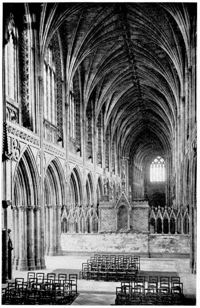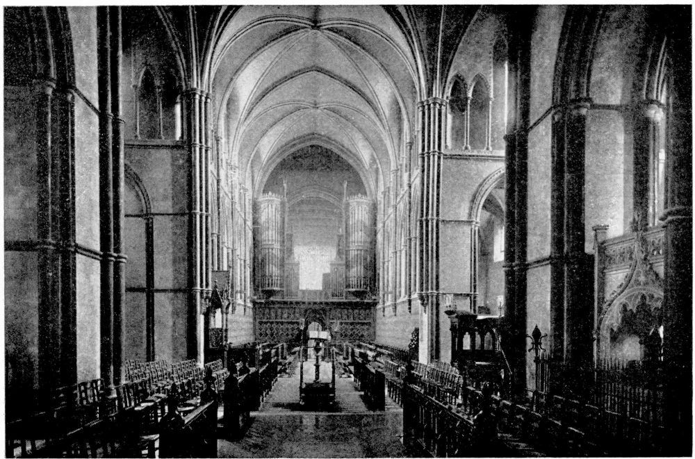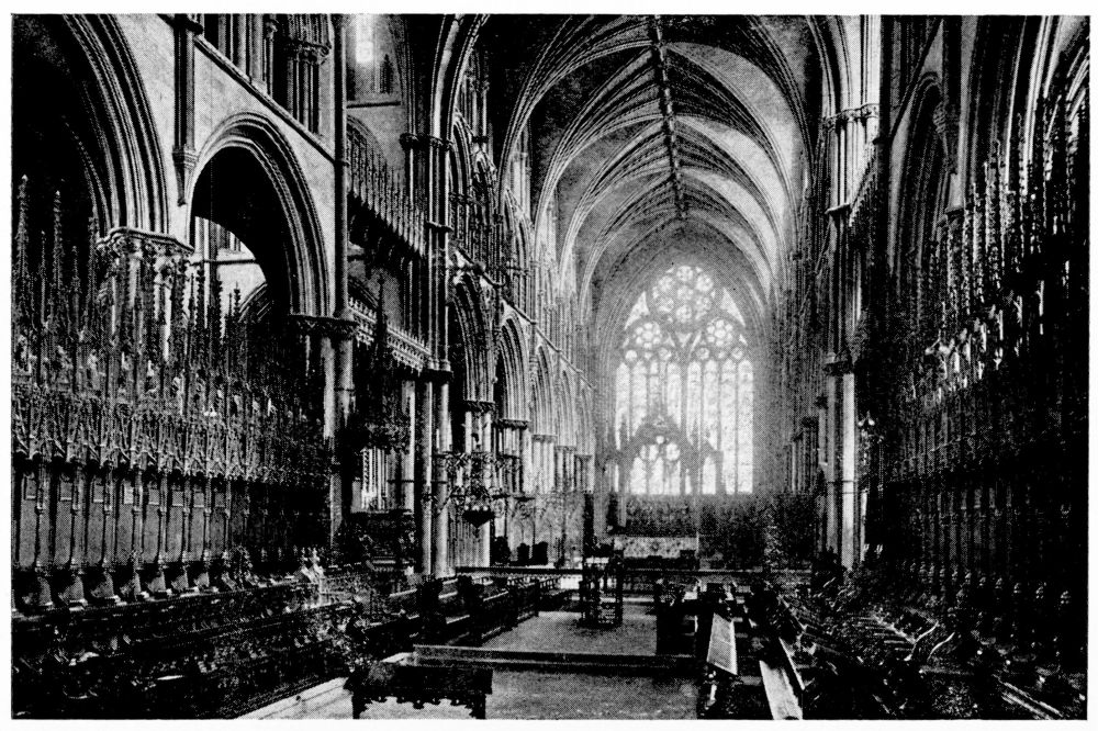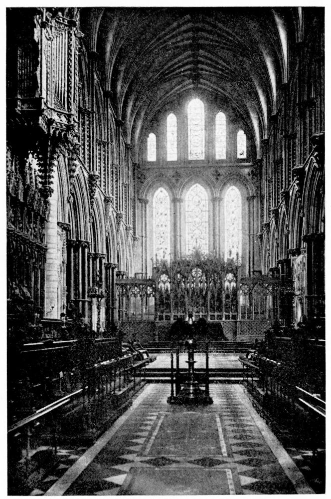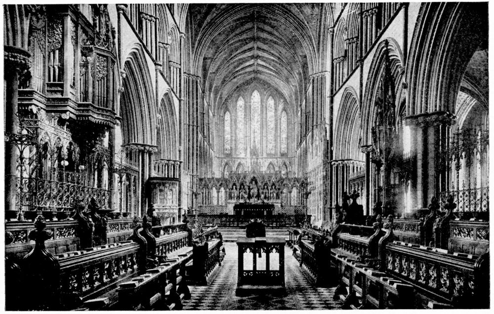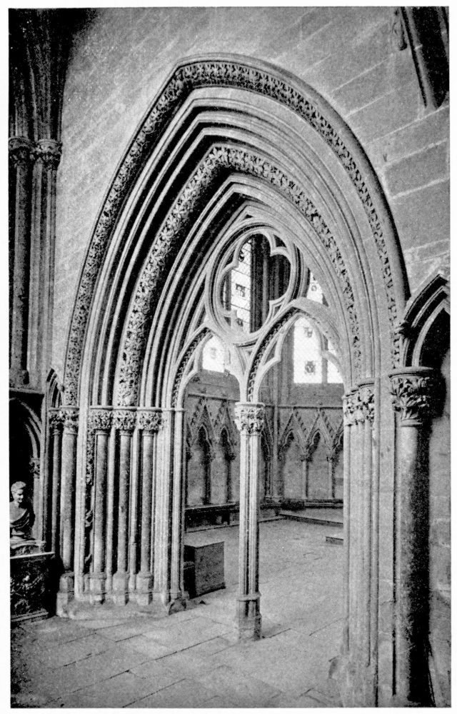 “As we see our cathedrals now, the view that meets us differs much from that which would have greeted us in mediæval times. Then all was ablaze with colours. Through the beautiful ancient glass the light gleamed on tints of gorgeous hues, and rich tapestries and hangings, on walls bedight with paintings, and every monument, pier and capital were aglow with coloured decorations. We have lost much, but still much remains. At the Reformation the avaricious courtiers of Henry VIII. plundered our sacred shrines, and carried off under the plea of banishing superstition vast stores of costly plate and jewels, tapestry and hangings. In the Civil War time riotous, fanatical soldiers wrought havoc everywhere, hacking beautifully-carved tombs and canopies, destroying brasses, and mutilating all that they could find. Ages of neglect have also left their marks upon our churches; and above all the hand of the ignorant and injudicious ‘restorer’ has fallen heavily on these legacies of Gothic art, destroying much that was of singular beauty, and replacing it by the miserable productions of early Nineteenth Century fabrication.”—(P. H. D.)