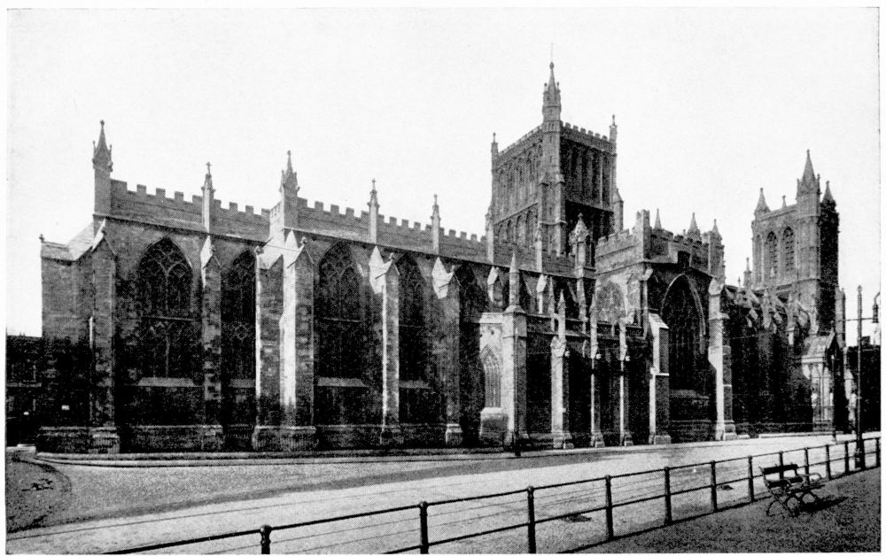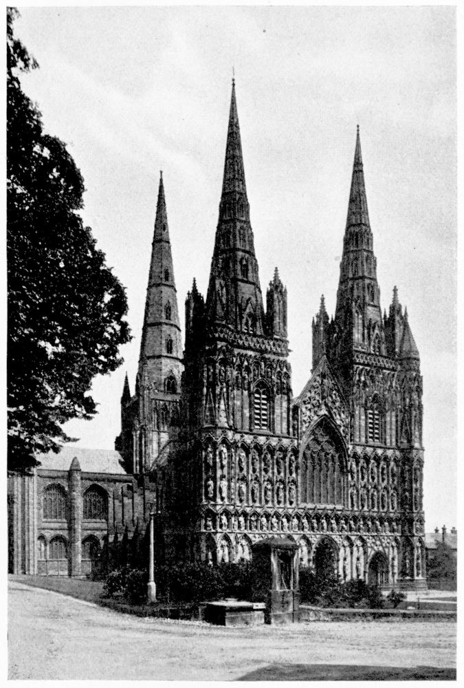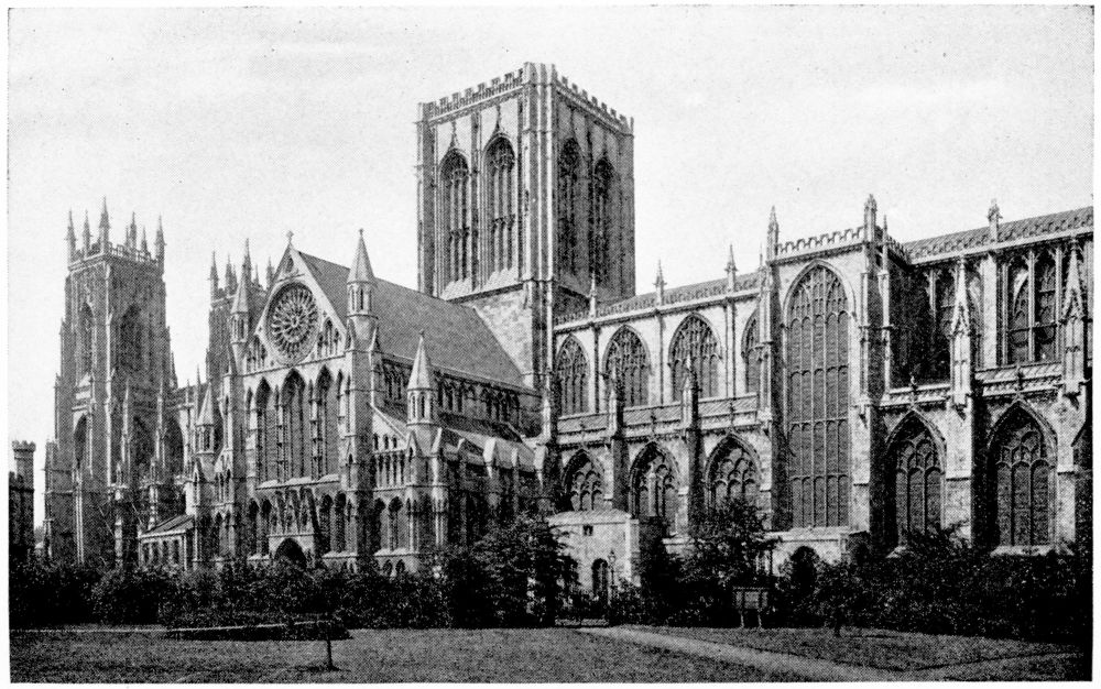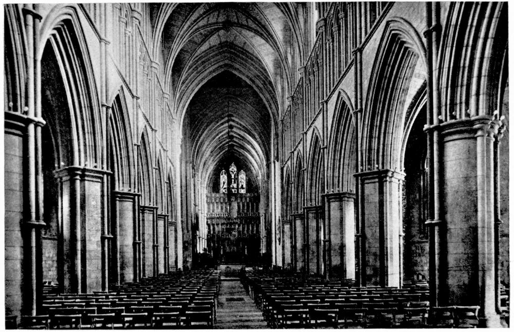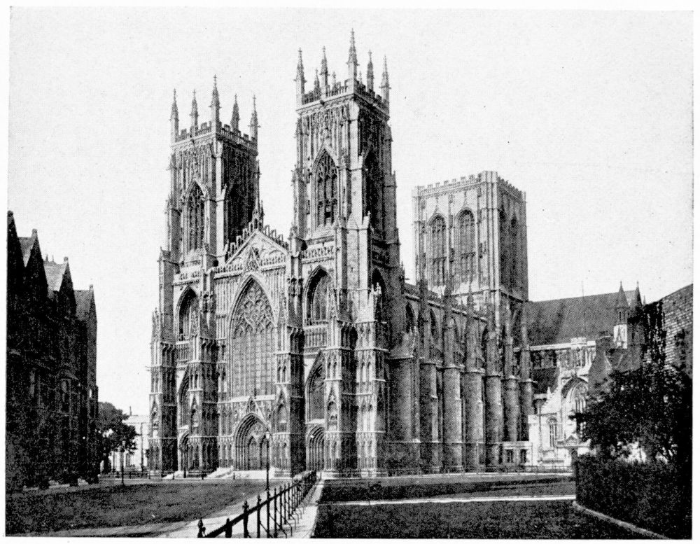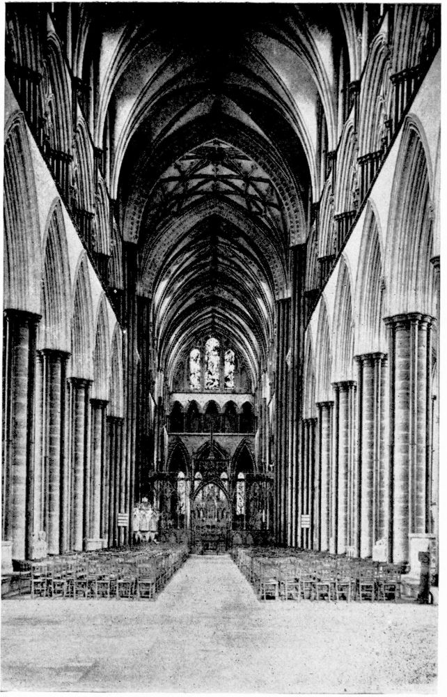 “As we see our cathedrals now, the view that meets us differs much from that which would have greeted us in mediæval times. Then all was ablaze with colours. Through the beautiful ancient glass the light gleamed on tints of gorgeous hues, and rich tapestries and hangings, on walls bedight with paintings, and every monument, pier and capital were aglow with coloured decorations. We have lost much, but still much remains. At the Reformation the avaricious courtiers of Henry VIII. plundered our sacred shrines, and carried off under the plea of banishing superstition vast stores of costly plate and jewels, tapestry and hangings. In the Civil War time riotous, fanatical soldiers wrought havoc everywhere, hacking beautifully-carved tombs and canopies, destroying brasses, and mutilating all that they could find. Ages of neglect have also left their marks upon our churches; and above all the hand of the ignorant and injudicious ‘restorer’ has fallen heavily on these legacies of Gothic art, destroying much that was of singular beauty, and replacing it by the miserable productions of early Nineteenth Century fabrication.”—(P. H. D.)
