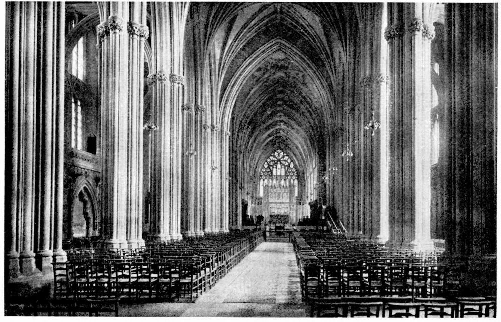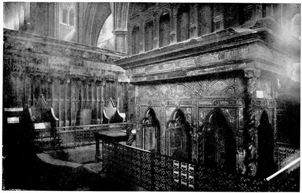 “In Italy the bones of a saint or martyr were almost invariably deposited either beneath or immediately in front of the altar. But in the Gothic nations this original notion of the burial-place of the Saints became obscured, in the increasing desire to give them a more honourable place. According to the precise system of orientation adopted by the German and Celtic nations, the eastern portion of the church was in those countries regarded as pre-eminently sacred. Thither the high altar was generally moved, and to it the eyes of the congregation were specially directed. And in the eagerness to give a higher and holier even than the highest and holiest place to any great saint, on whom popular devotion was fastened, there sprang up in most of the larger churches during the Thirteenth Century a fashion of throwing out a still further eastern end, in which the shrine or altar of the saint might be erected,—and to which, therefore, not merely the gaze of the whole congregation, but of the officiating priest himself, even as he stood before the high altar, might be constantly turned. Thus, according to{x} Fuller’s quaint remark, the superstitious reverence for the dead reached its highest pitch, ‘the porch saying to the churchyard, the church to the porch, the chancel to the church, the east end to all—“Stand further off, I am holier than thou.”’ This notion happened to coincide in point of time with the burst of devotion towards the Virgin Mary, which took place under the Pontificate of Innocent III., during the first years of the Thirteenth Century; and, therefore, in all cases where there was no special local saint, this eastern end was dedicated to Our Lady and the chapel thus formed was called The Lady-Chapel. Such was the case in the Cathedrals of Salisbury, Norwich, Hereford, Wells, Gloucester and Chester. But when the popular feeling of any city or neighbourhood had been directed to some indigenous object of devotion, this at once took the highest place, and the Lady-Chapel, if any there were, was thrust down to a less honourable position. Of this arrangement, the most notable instances in England are, or were (for in many cases the very sites have perished), the shrines of St. Alban in Hertfordshire, St. Edmund at Bury, St. Edward in Westminster Abbey, St. Cuthbert at Durham, and St. Etheldreda at Ely.”—(A. P. S.)