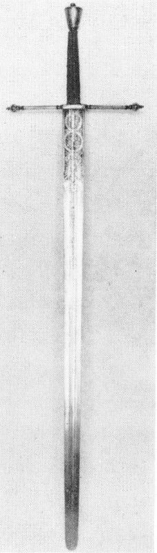 By the fifteenth century the crossbar and the hilt had become longer, giving the weapon a better balance, but the general character of the arm remained the same. With the longer hilt, both hands could be used, considerably increasing the power of the weapon (Fig. 29 [1], also title page illustration). This tendency continued in the sixteenth century until it culminated in the enormous two-handed swords used by the professional mercenary soldiers, or landesknechts (Fig. 29 [2]). Such swords were over five feet long, with immense drooping guards and long leather-wrapped hilts.