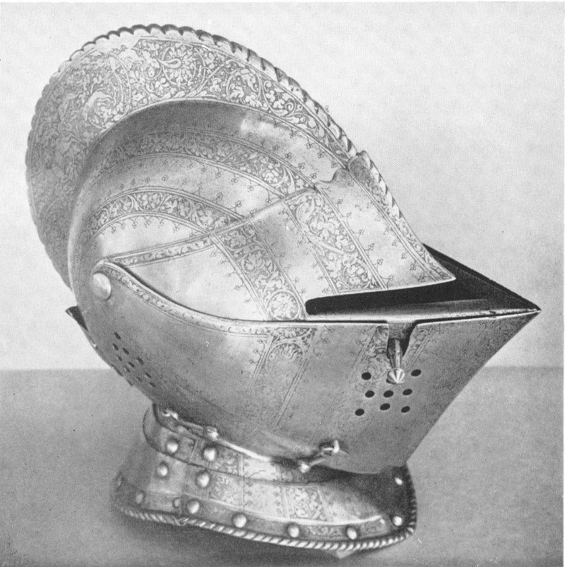 But the helmet in Fig. 26, probably a century or more earlier, shows a much greater appreciation of sculptural form. With a row of parallel vertical flutings around its domed upper part, it resembles closely the Maximilian armor of contemporary Europe. It is doubtful, however, if many European smiths could have forged the minaret-like pinnacle which terminates the dome. The helmet is decorated with damascene work of silver in calligraphic inscriptions and arabesques. Its owner’s neck was protected by chain mail attached around the lower edge of the helmet. Probably because of the warmer climate, the Saracenic warriors never adopted the closed helmet of European lands, but preferred to leave the face exposed, or protected only by a nasal bar which was often so arranged that it could be slid upwards and clamped.