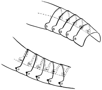Two particular devices aided in making such flexibility possible. Where the body needed protection combined with motility it could be covered with a series of narrow, overlapping steel strips, each of which was riveted in turn to one or more leather straps, the ends of which were fastened to the solid main defense. Then as the body was flexed the steel strips or lames would slide over one another without exposing the body beneath them (Fig. 21). It was also possible to join a series of lames by not more than two rivets for each pair; these would act as pivots, allowing one lame to rotate slightly relative to the other (Fig. 22). However, if rivets were used with rather large heads with a washer under the burred end of each, and if the holes for the rivet in one lame were round while that in the other had the form of a slot, in addition to the pivoting motion, a certain 19 amount of sideways motion between the lames would be possible (Fig. 23).