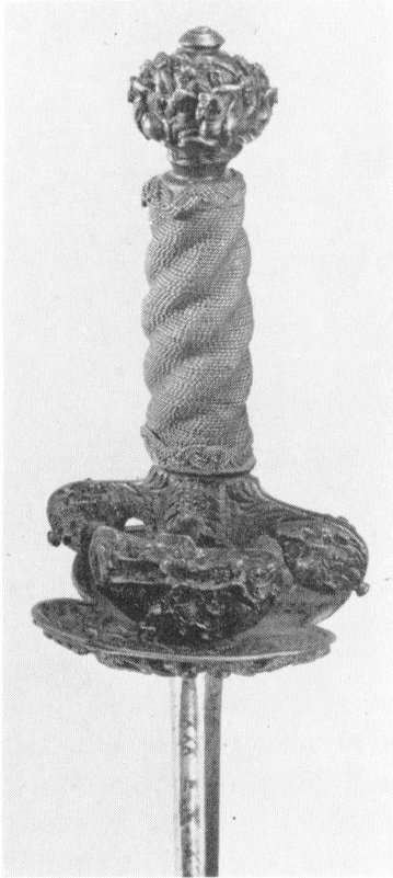 Fig. 30. How many figures are carved in the solid steel of this court sword hilt?