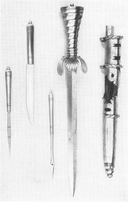 Fig. 32. An outfit for a hunter: dagger, knife, awl, and larding needle, all fitting into one scabbard.