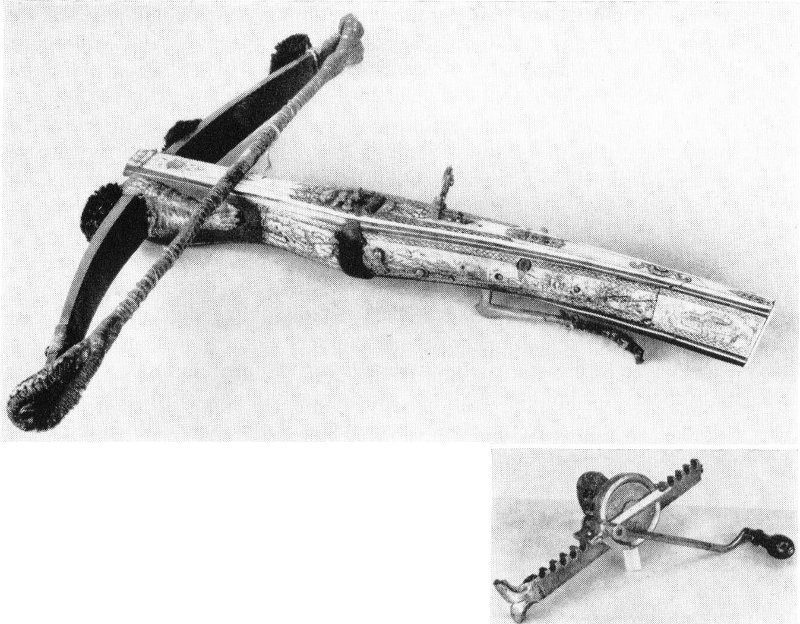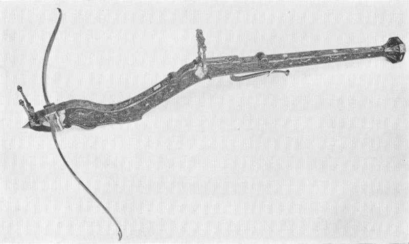 The first projectile-throwing arm appropriate to an art museum is the crossbow, which is simply a bow mounted on a wooden stock provided with a catch and trigger, so that the bow could be carried ready to shoot. This was a great convenience in hunting or war, because otherwise the time lost in drawing the bow might give the victim opportunity to escape. Moreover, it was soon found that the application of mechanical devices permitted the use of a bow much stronger than any man could draw unaided.
