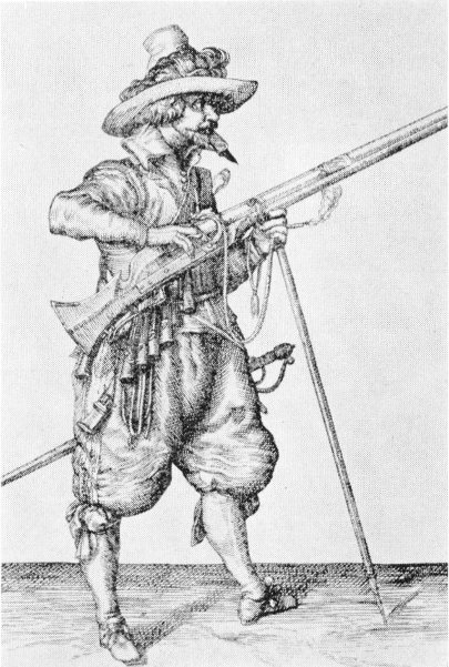 Fig. 42. This is how a musketeer looked when he was just getting ready to aim his gun. He has more gadgets than even a modern infantryman.