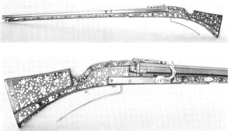 Another, rifled, specimen, from about 1635, formerly in the Liechtenstein collection (Fig. 46 [2]) has a plain barrel, but the lock is finely engraved with a hunting scene, while the stock (Fig. 47 [2]) is most elaborately inlaid 36 with fine filigrees and engraved plates of stag horn representing mythological characters, animals, and monsters against an architectural and arabesque background. The stock bears the mark of Martin Süssebecker, who was born at Liegnitz in 1593, and died in 1668 at Dresden where he was gunmaker to the court of the Electors of Saxony.