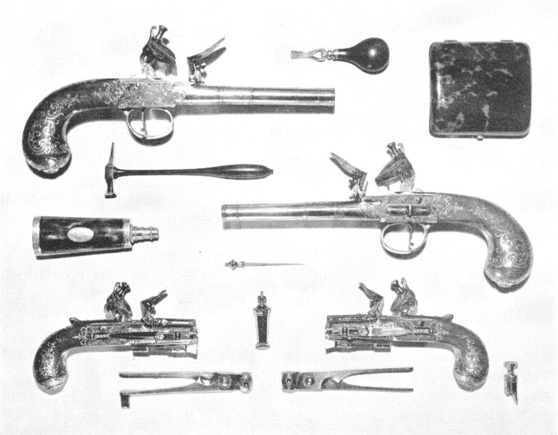 Fig. 50 illustrates a very complete outfit of pistols and accessories made at Lisbon, Portugal, by Jacinto Xavier in 1799. There are a pair of double barreled holster pistols for rides abroad, and a pair of small but deadly pocket pistols for self defense or card table arguments. With these are the accessories and tools appropriate to them: powder flask, powder measure, bullet molds, oil can, hammer, screw driver, awl, (for cleaning the touch holes), and box for spare flints and bullets. All are enclosed in a handsome mahogany case.