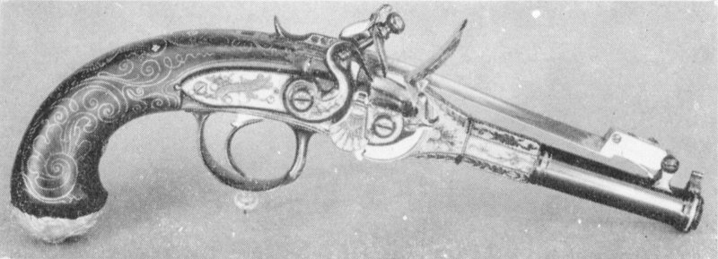 The most remarkable feature of this pistol, however, is its ingenious repeating mechanism. The type, though rare, is well known. It seems to have been invented about one hundred years previous, toward the close of the seventeenth century, by a Florentine gunsmith named Lorenzoni. During the following hundred years it was extensively copied. Arms with this type of mechanism are known bearing the signatures of Austrian, German, French, English, and Spanish gunsmiths. Variations and improvements show themselves from time to time, but a complete study of the Lorenzoni type of flintlock repeater has yet to be written. Its general principle, however, is as follows: a cylinder of brass, lying transversely across the body of the pistol, can be rotated a half turn by a lever. As this is done, the cylinder picks up a bullet, gunpowder, and priming powder, and conveys them to the proper positions for firing. Lugs on the cylinder also close the pan cover and cock the hammer. The magazines hold supplies for eight shots, which can thus be fired with practically the speed of the single action frontier revolver which was, for many years, the most famous of American arms. Think what changes in history a liberal supply of breech-loading repeating firearms of this type might have made had it been available throughout the eighteenth century! But unfortunately very few gunsmiths were skillful enough to do the precise work required on an arm of this type, and all who ever lived would not have been able to make enough of them to outfit a regiment. Such arms were rare and costly, and only princes could afford them, but we are fortunate that this specimen has come down to us to show what Master Derby of Paris could do generations before the day of Colt, Winchester, and the all-destructive Atom.