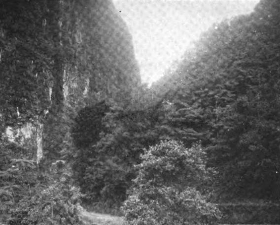 The roads which thread the island like a net are constantly cared for. Winding in and out and ever upward to dizzy heights, they lead through impenetrable jungle, thickets of bamboo and giant tree ferns, affording from occasional open spaces glimpses of shadowy ravines and bounding torrents hemmed in by farther peaks in serried ranks that beggar description, descending again toward the western side through mile upon mile of soft gray-green waving cane, till one comes at last to the blue Atlantic beating itself into froth upon the sands at Trinité.