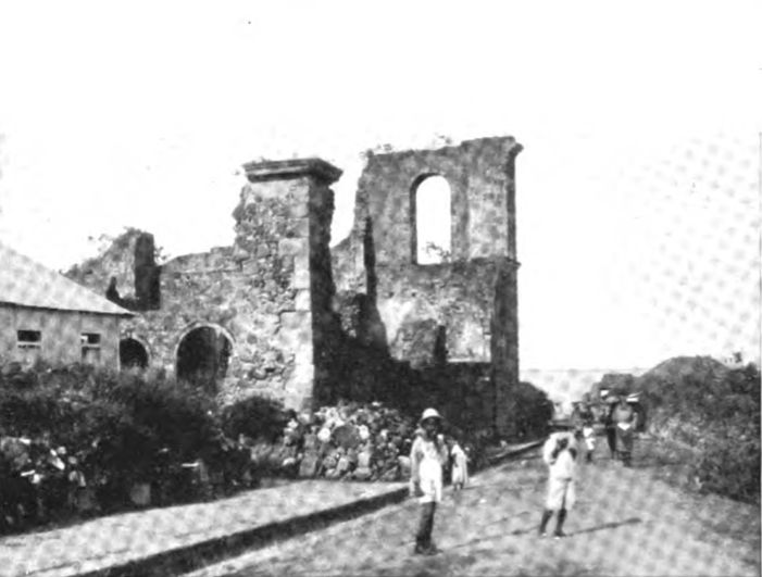 We visited again and again the grim ruin of St. Pierre, now overgrown with a rank growth of flowers and vines, a sorry spectacle. High on the cliff above the town, dominating the scene of ruin, stands the lovely marble statue of the Virgin, all that remained intact in the great cathedral that fateful day.