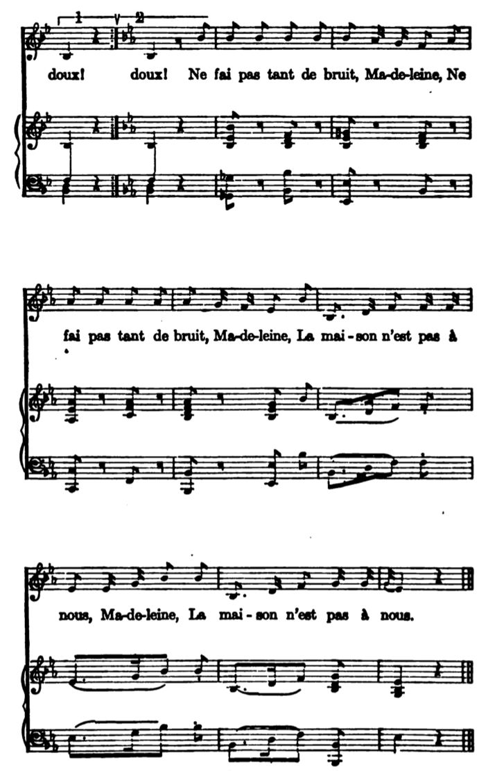 The other melodies which are given as specimens of Martinique music show less of the African element,—the nearest approach to it being in Tant sirop; but all are probably creations of the mixed race. Marie-Clémence is a Carnival satire composed not more than four years ago. To-to-to is very old—dates back, perhaps, to the time of the belles-affranchies. It is seldom sung now except by survivors of the old régime: the sincerity and tenderness of the emotion that inspired it—the old sweetness of heart and simplicity of thought,—are passing forever away.