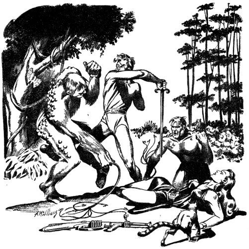The short stub of his arm drew back, swung, and needles of fire raced through it as he struck Margaret's jaw. Her grip slackened and with a heave of his muscles he broke loose. He raised his sword—and knew himself for a sentimental fool. Earth repressions still in his mind would not let him kill a woman. Not even this woman.