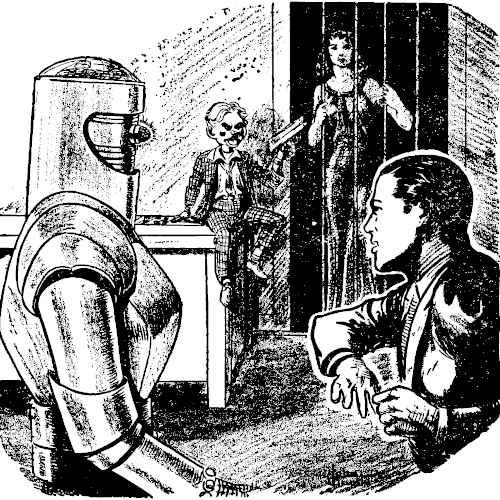 His wooden hand moved across the desk-top and touched a button. A section of the wall slid back like a stage curtain, revealing an opening the size of a closet door. The opening was fenced in with a metal grating. Behind it stood Shannon Cole, her long black hair awry, her face pale, her cloth-of-gold pajamas rumpled.