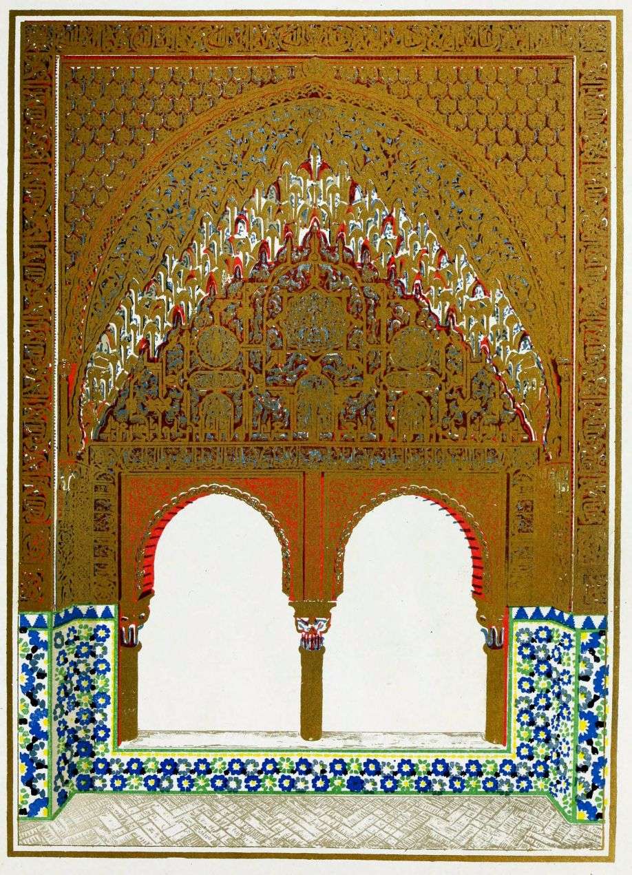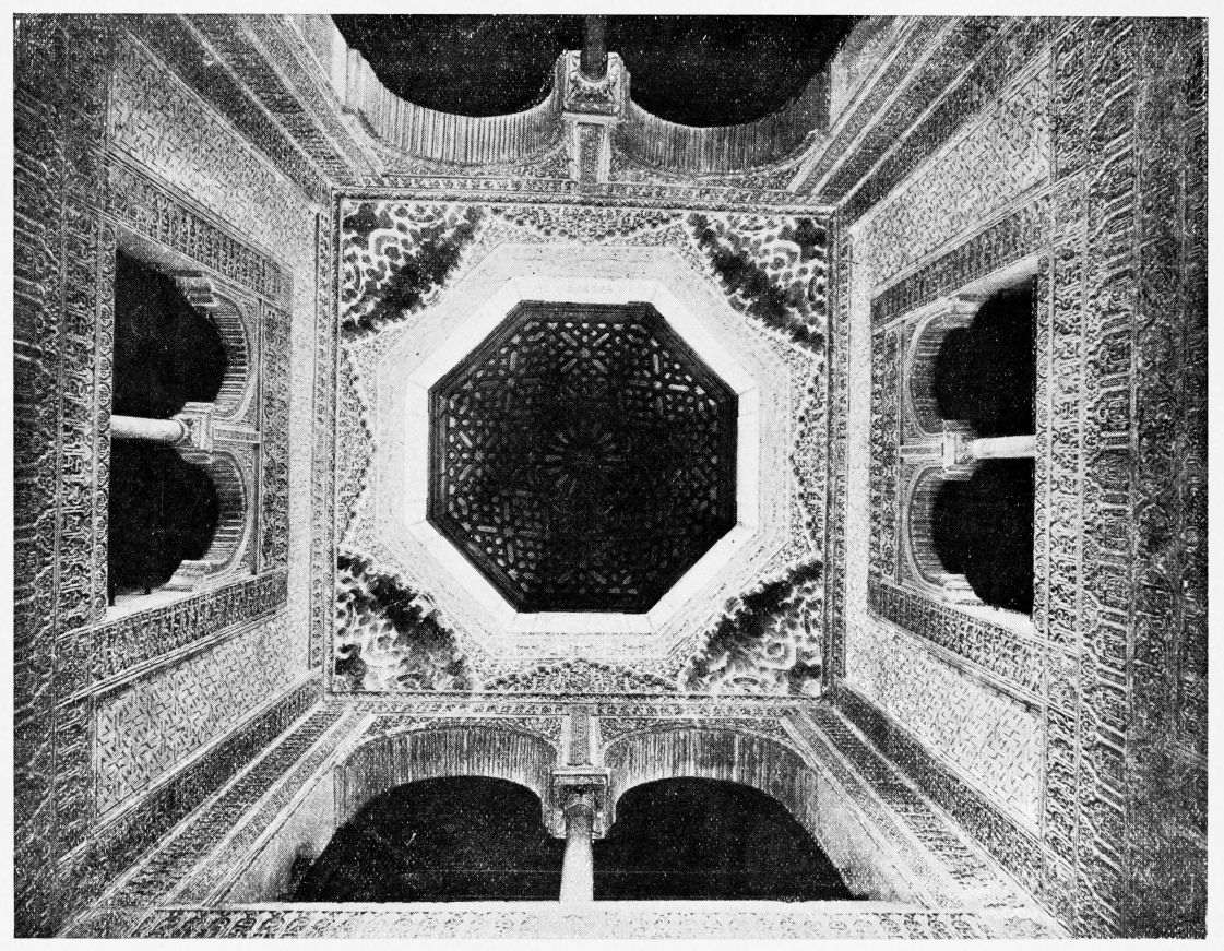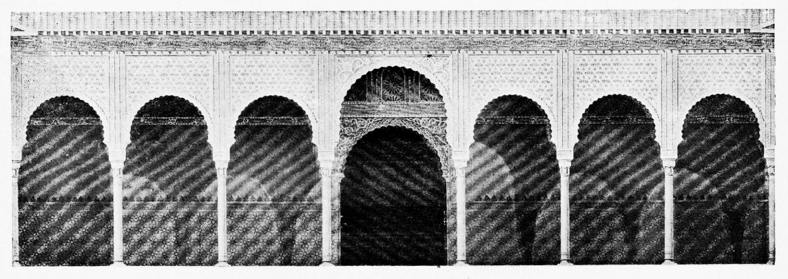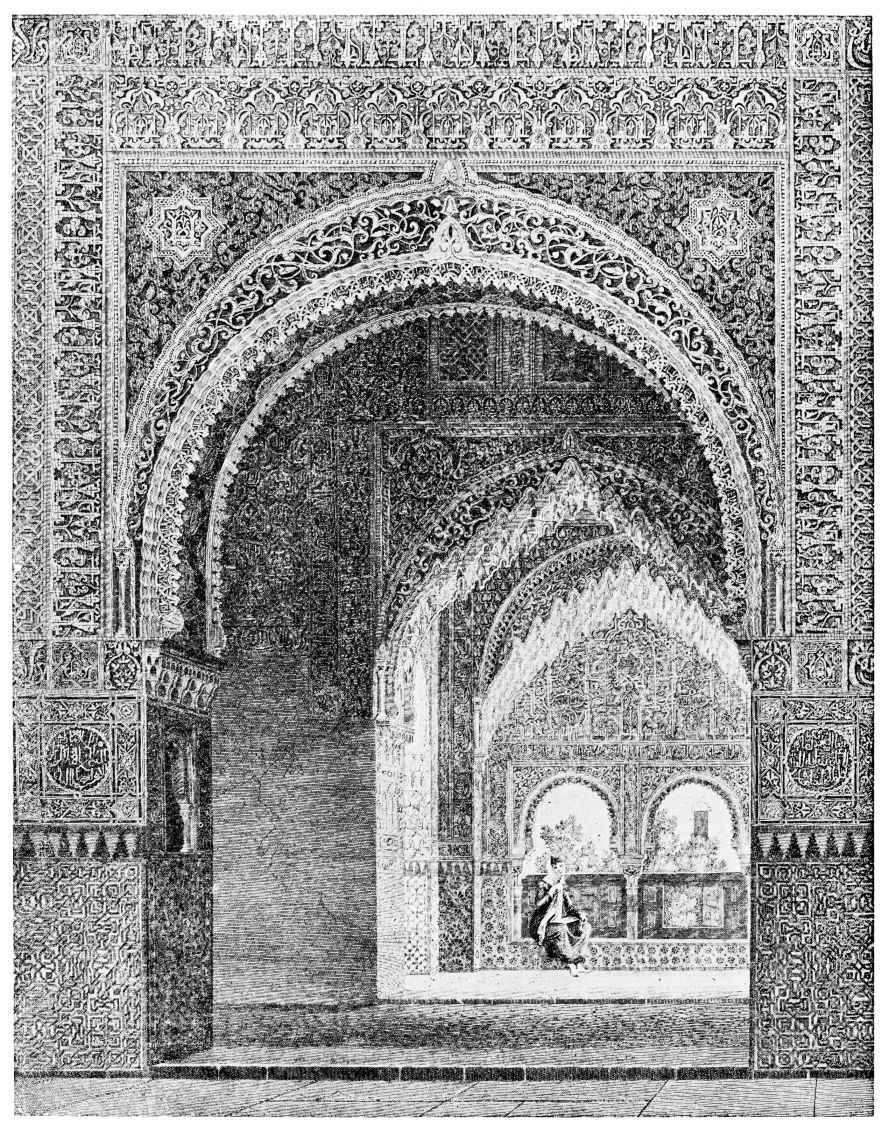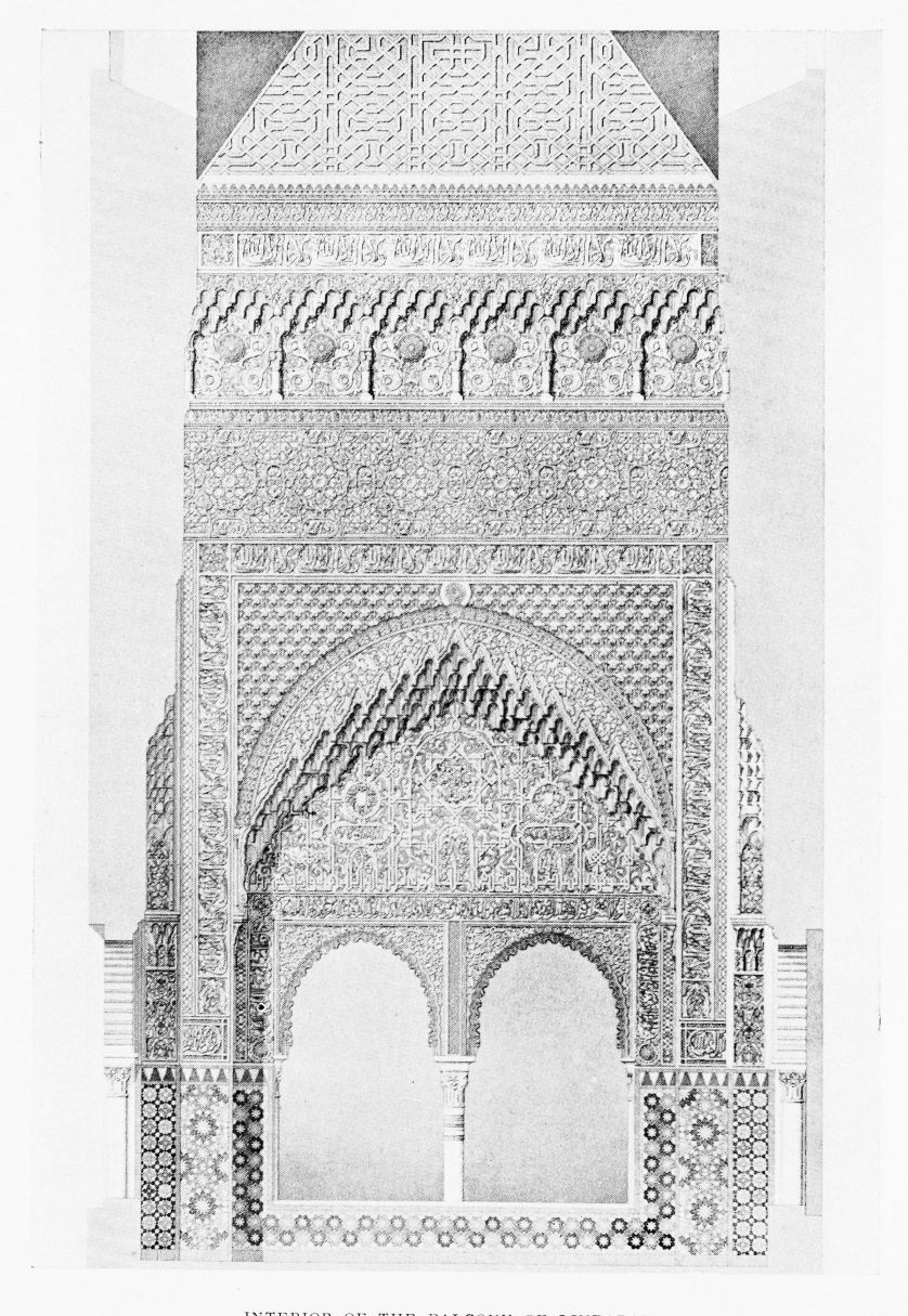 Don Mariano Contreras, Conservator of the Alhambra, the son of the gifted Raphaël Contreras, who devoted thirty-seven years of his life to the restoration of the Palace—gave me the benefit of his knowledge of this unique treasure-house of art; and I have also laid under contribution the beautiful plates of Owen Jones, who disposed of a Welsh inheritance in order to produce his great work on the Plans, Elevations, Sections and Details of the Alhambra. Jones’s Grammar of Ornament, which has been described as “beautiful enough to be the horn-book of the Angels,” also contains the result of his researches in the Alhambra, which occupied him for the greater part of eleven years. A selection of these illustrations is here rescued from the obscurity of public libraries and the inaccessible recesses of private collections. The inclusion of John F. Lewis’s drawings, and the reproduction of a series of pictures by James C. Murphy, who spent seven years in the study of the artistic marvels of the Alhambra, I do not feel called upon to defend. The photographs, several of which were placed at my disposal by Don Rafaël Garzón, represent the buildings as they appear to-day; the drawings were made before the Palace was damaged by the disastrous fire of September, 1890.{ix}