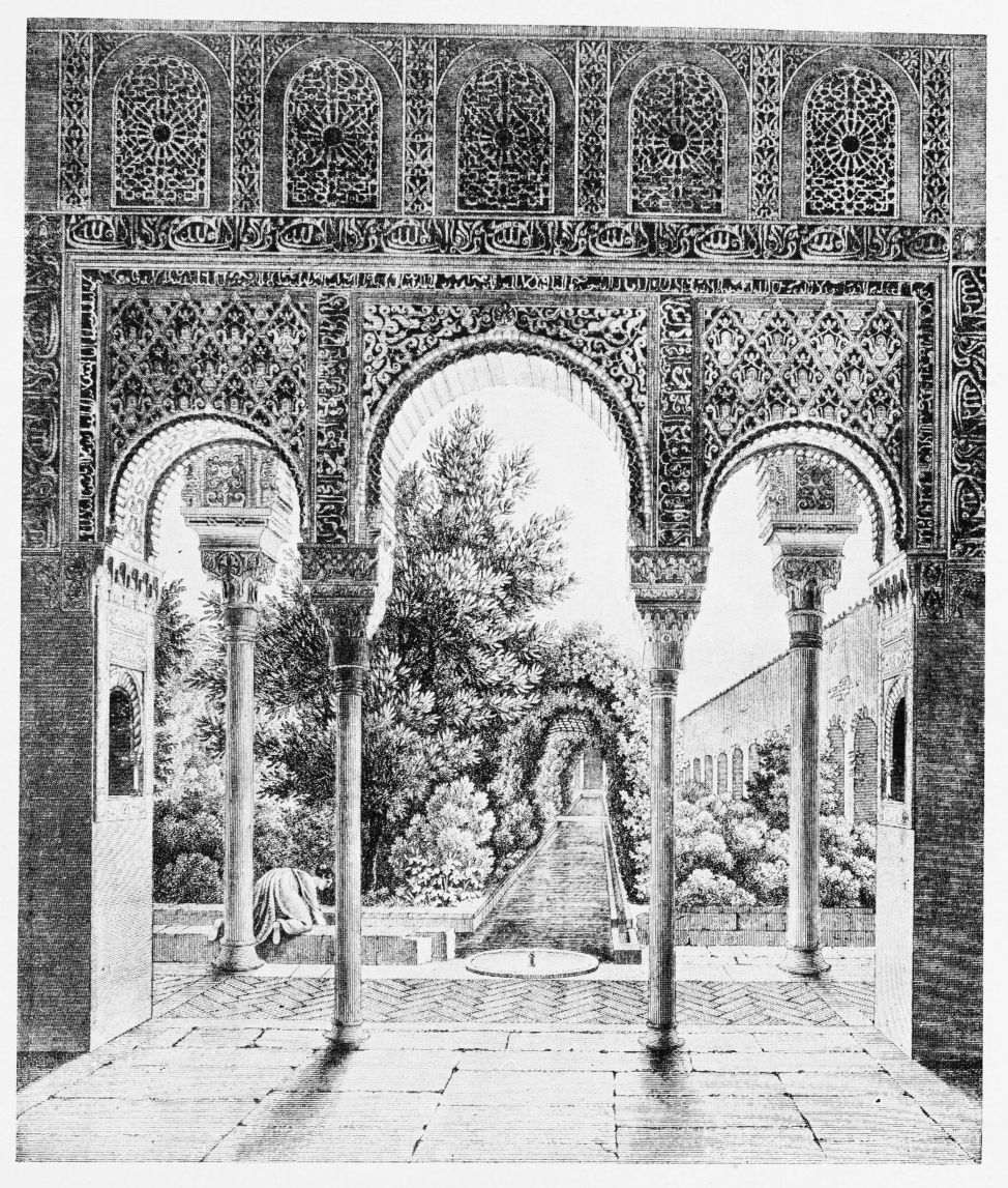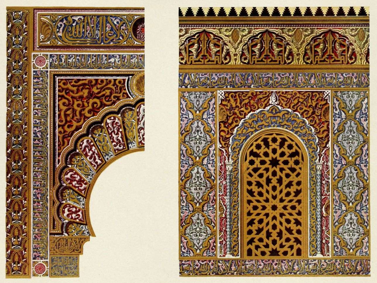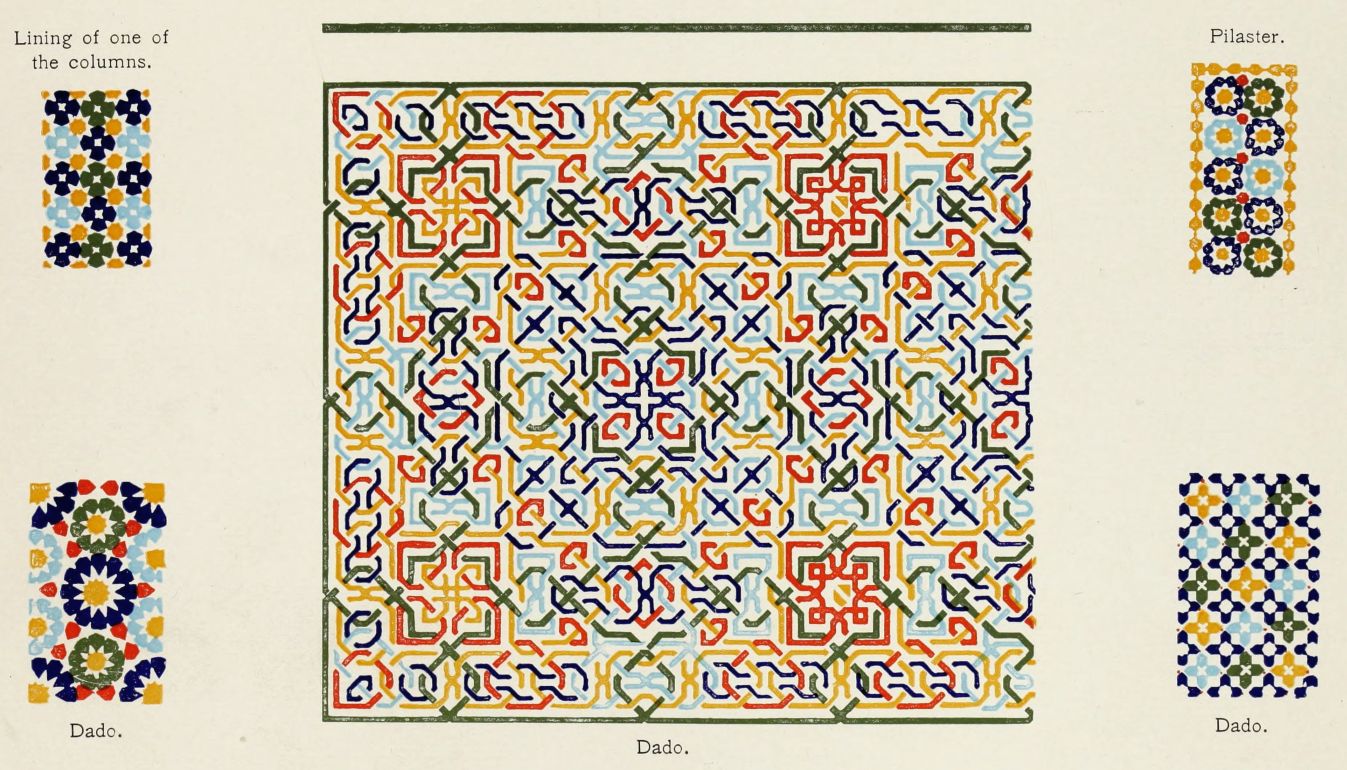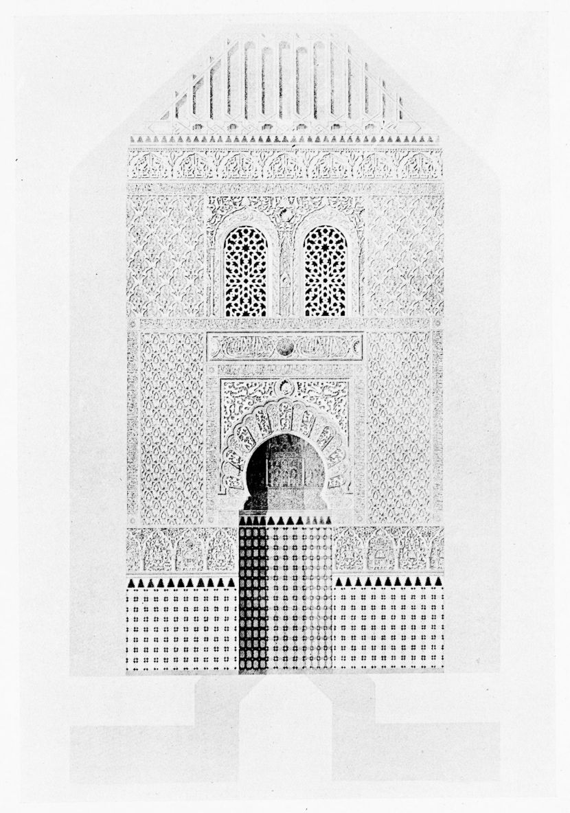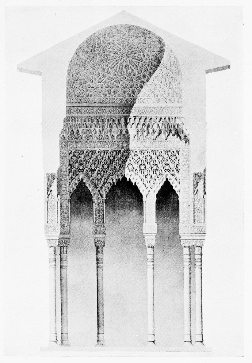 Don Mariano Contreras, Conservator of the Alhambra, the son of the gifted Raphaël Contreras, who devoted thirty-seven years of his life to the restoration of the Palace—gave me the benefit of his knowledge of this unique treasure-house of art; and I have also laid under contribution the beautiful plates of Owen Jones, who disposed of a Welsh inheritance in order to produce his great work on the Plans, Elevations, Sections and Details of the Alhambra. Jones’s Grammar of Ornament, which has been described as “beautiful enough to be the horn-book of the Angels,” also contains the result of his researches in the Alhambra, which occupied him for the greater part of eleven years. A selection of these illustrations is here rescued from the obscurity of public libraries and the inaccessible recesses of private collections. The inclusion of John F. Lewis’s drawings, and the reproduction of a series of pictures by James C. Murphy, who spent seven years in the study of the artistic marvels of the Alhambra, I do not feel called upon to defend. The photographs, several of which were placed at my disposal by Don Rafaël Garzón, represent the buildings as they appear to-day; the drawings were made before the Palace was damaged by the disastrous fire of September, 1890.{ix}