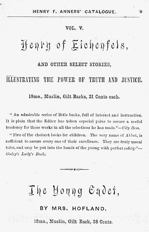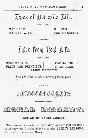 “Five of the choicest books for children. The very name of Abbot, is sufficient to ensure every one of their excellence. They are truly moral tales, and may be put into the hands of the young with perfect safety.”—Godey’s Lady’s Book.