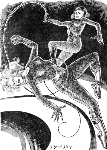 Instinctively Naomi clutched for my whip, but I recoiled it in time and swung a second time. It cut searingly into her side, winding about her waist with a python action that crushed out her breath. I moved in for the kill with uplifted claws. Suddenly Naomi leaped from the dais, high into the air.